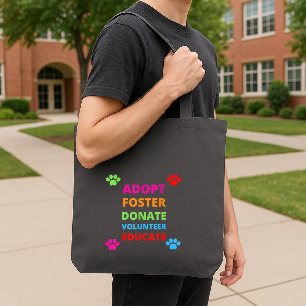Chic, durable, and reusable, this Adopt Foster Donate Volunteer Educate Dog Tote Canvas Bag canvas tote bag is your daily go-to or a thoughtful gift for any occasion.